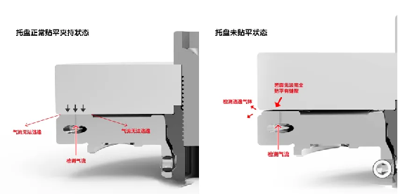 Tepenin stabilitesini sağlamak ve konumlandırma gereksinimlerini karşılamak için, sıfır konumlandırıcı bir kelepçe algılama cihazı eklemelidir, bu cihazın amacı sıfır konumlandırıcının tepsinin konumlandırma yüzeyine tamamen temas edebilmesini ve ortada demir kesim veya diğer enkazların olmasını sağlamaktır. Çalışma prensibi Şekil (1) 'de gösterilmiştir. Tespit havası deliğin dışında (0.2MPa) hava basıncını serbest bırakacaktır. Akış sensörünün derecelendirme değerini ayarlayın. Tepsisi, Şekil 2'de gösterildiği gibi konumlandırıcı ile düz olmadığında, tespit edilen kaçan gaz boşluk boyunca dışa doğru kaçacaktır ve akış sensörü, sıkıştırma algılamasını gerçekleştirmek için akış farkını belirleyecektir. Tespit deliği ayrıca stoma temizliğini sağlamak için 0.6MPa temizleme basıncını dışa doğru püskürtecektir. Birden fazla konumlandırıcı aynı anda tespit edilebilir, böylece maliyetleri azaltır; 2. Birden fazla konumlandırıcıda bir sızıntı akış değeri olduğunda, önceden ayarlanmış akış değeri ile tutarsız olacaktır, bu nedenle daha güvenlidir; 3. Algılama yöntemi daha doğrudan, tepsi yüklenmez ve konumlandırıcı boş klip algılanabilir.